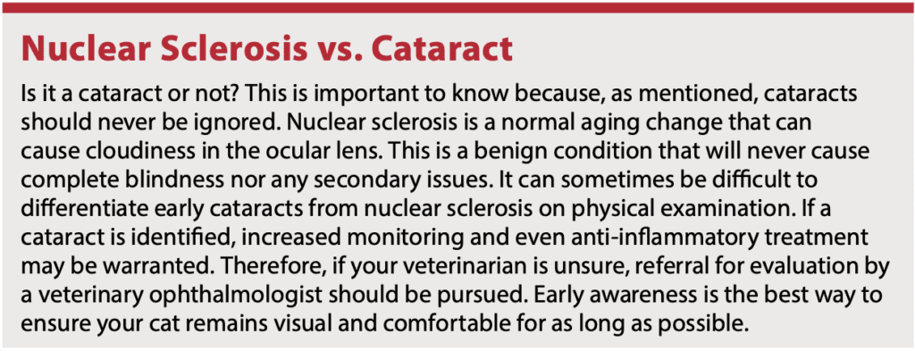 Cataracts in cats should never be ignored. If your cat develops a cataract, be sure to see your veterinarian to identify and treat any underlying causes, and to determine the best course of action for your cat. Whether that is medical management or surgical correction by a veterinary ophthalmologist, your cat will require frequent, careful monitoring for the rest of his or her life to ensure he or she continues to be pain-free and visual for as long as possible.
