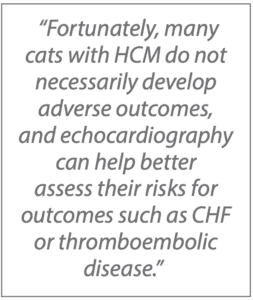 “HCM affects one out of seven cats, which is a consistent finding across multiple prevalence-type studies. Fortunately, many cats with HCM do not necessarily develop adverse outcomes, and echocardiography can help better assess their risks for outcomes such as CHF or thromboembolic disease,” says Weihow Hsue, DVM, assistant professor in the section of cardiology at Cornell University’s College of Veterinary Medicine.