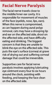 Almost all cats undergoing VBO will wake up with Horner’s syndrome and sometimes even facial nerve paralysis. Fortunately, these complications are typically transient.