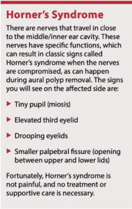 If these cases go untreated long enough, an affected cat may develop inflammation or infection in the middle ear, with associated signs including Horner’s syndrome and facial nerve paralysis (see sidebars), or even inflammation/infection in the inner ear with signs including head tilt, unusual back-and-forth jerking eye movements (nystagmus), loss of balance, and even deafness. From the inner ear, inflammation/infection can spread to the brain, so it is important to get on top of things before this happens.