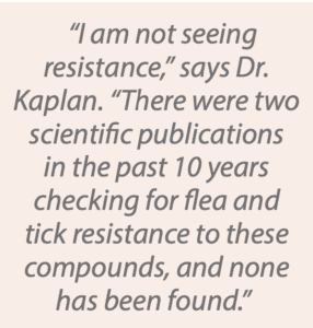 Periodically, rumors emerge about fleas and ticks developing resistance to common parasite control medications. Dr. Kaplan suggests that we should not believe all the scuttlebutt. “I am not seeing resistance,” says Dr. Kaplan. “There were two scientific publications in the past 10 years checking for flea and tick resistance to these compounds, and none has been found.”