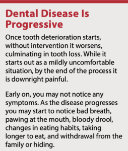 “The gold standard for oral hygiene is at-home dental care in the form of daily tooth brushing using veterinary approved products,” says Dr. Chrostek. “A soft bristle brush and veterinary approved enzymatic toothpaste are used. Our dentistry and oral surgery department routinely gives samples of Virbac CET Enzymatic Dog and Cat Toothpaste to clients after receiving a periodontal assessment and treatment to ensure continued at-home oral health.” See the accompanying sidebar for recommended dental-care products.