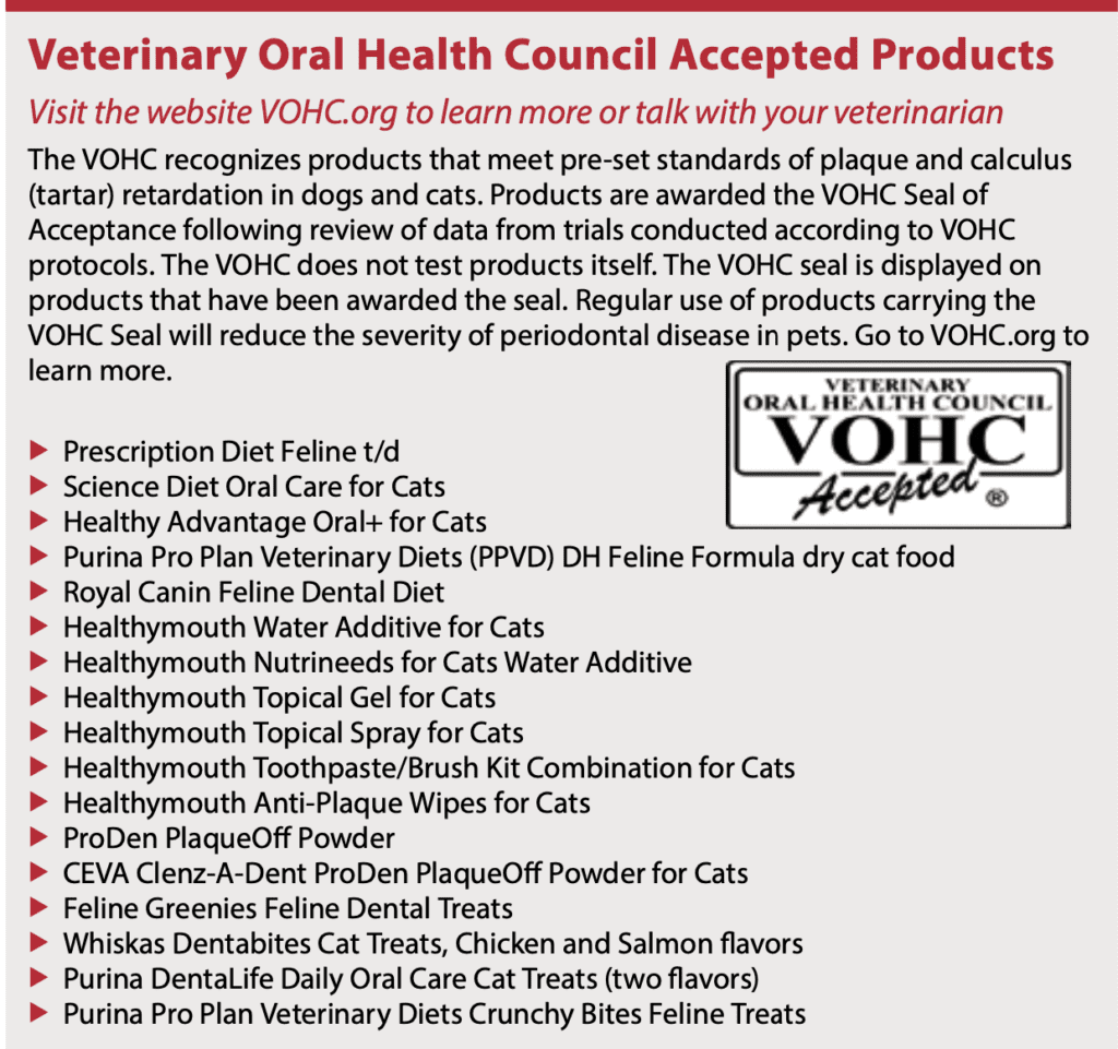 In addition to alternative brands of enzymatic veterinary toothpaste approved by VOHC, you can consider prescription diets, water additives, gels, sprays, wipes, and powders. (See sidebar with current list of VOHC-approved products for cats.) When using these other approaches, it is important to be sensible about it.
