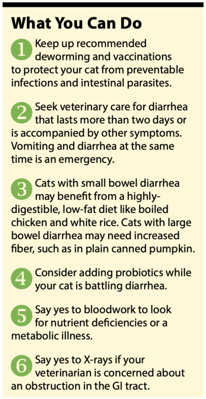 If your cat has diarrhea for more than two days or shows additional signs of illness, it’s time to call your veterinarian and bag up a fresh poop sample from the litterbox to bring to the appointment.