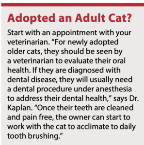 “I always educate clients about the importance of daily tooth brushing to maintain oral health,” says Dr. Kaplan. “You need to get the cat used to having their mouth/face touched, lips lifted, and so on before you start to brush. Cats don’t know what tooth brushing is, and if we scare them by trying to brush from the get-go, they will not allow it or will make it a struggle. I encourage owners to start by touching the cat’s face and lips and then giving a treat for positive reinforcement and building from there.” Flavored, enzymatic pet toothpastes are popular with many cats, and it is important to only use toothpaste that is designed for use in cats (human toothpaste can be toxic to cats).