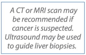 The next diagnostic step usually involves imaging. This can be done with abdominal X-rays and/or ultrasound. Ultrasound tends to be higher yield for liver cases, as it gives the radiologist a dynamic three-dimensional view of everything in the abdomen. Ultrasound is also a better way to image the pancreas and intestines, an important aspect of ruling out a condition called triaditis, in which the liver, pancreas, and small bowel are inflamed. CT or MRI may be recommended if cancer is suspected. Ultrasound can also be used to guide liver biopsies if needed.