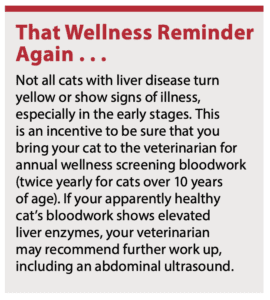 If you notice that the whites of your cat’s eyes appear yellow (jaundiced), she may be suffering from liver disease even if she isn’t acting sick. This is not the time to guess. It’s time to get your cat into the veterinarian.